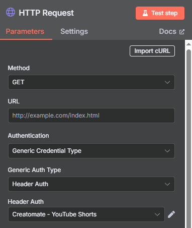 By default, you need to manually configure parameters such as the method, URL, headers, and body. However, there's an easier option: you can import a cURL command directly from Creatomate, which will automatically fill in all the necessary fields for you. To do this, click Import cURL: