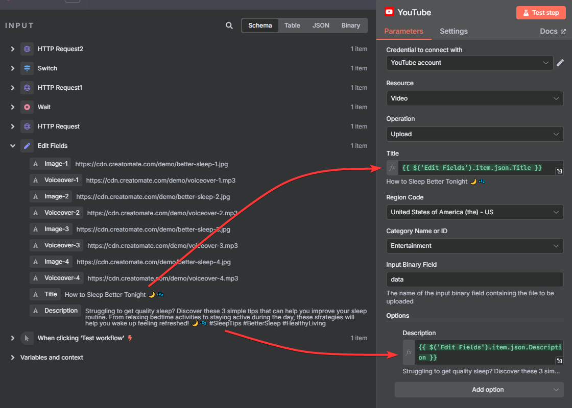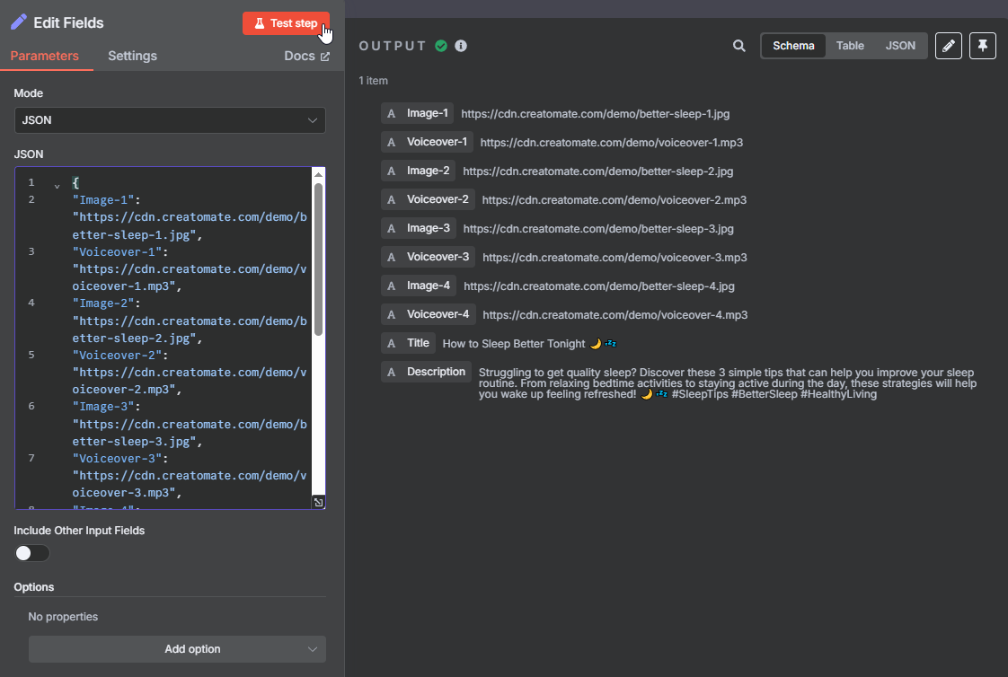 If you also want to include a description, click Add option, select Description, and map it to Edit Fields → Description: