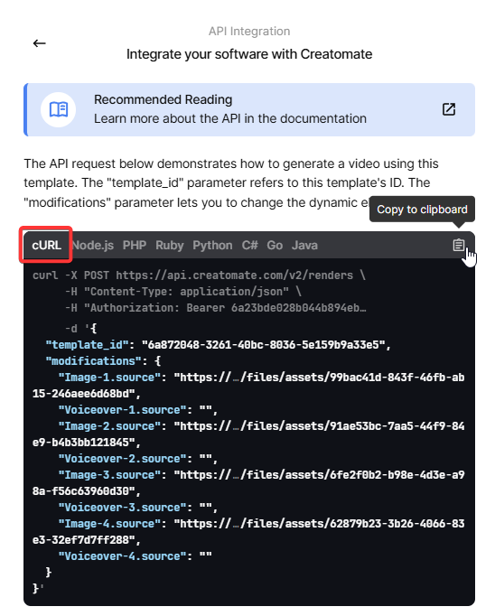 In the Creatomate template editor, click Use Template in the top-right corner. Go to API Integration and copy the generated cURL command: