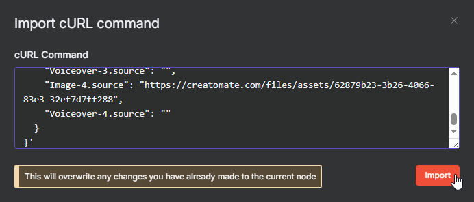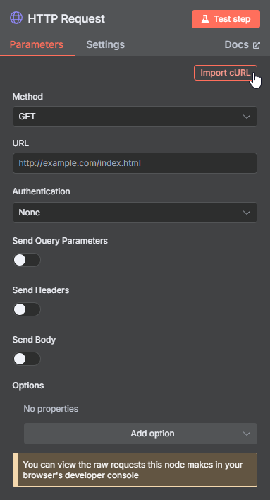 Add an HTTP Request node. For quick setup, click Import cURL: