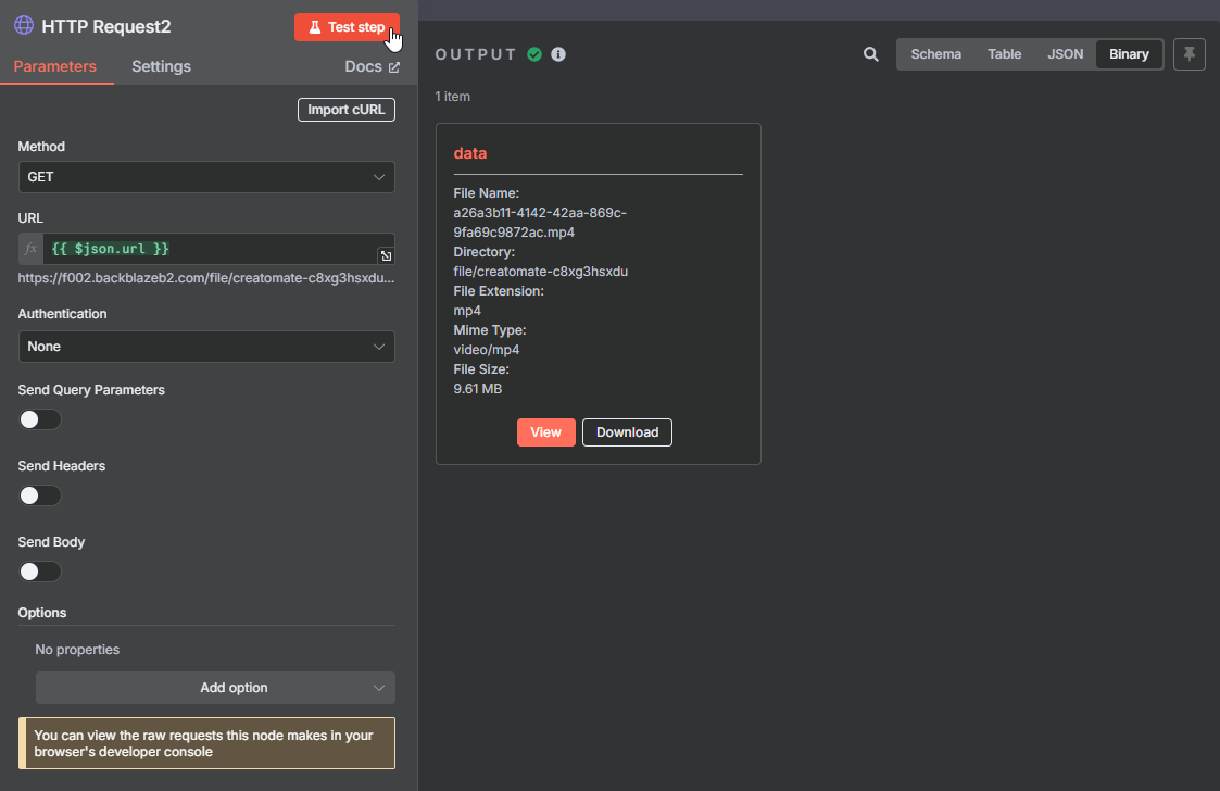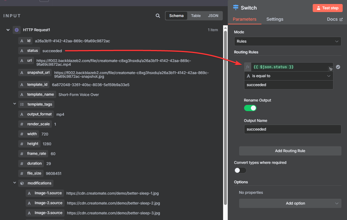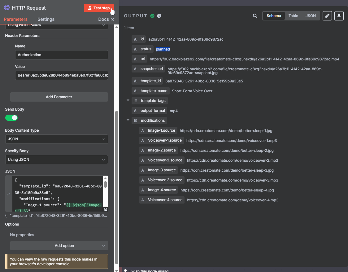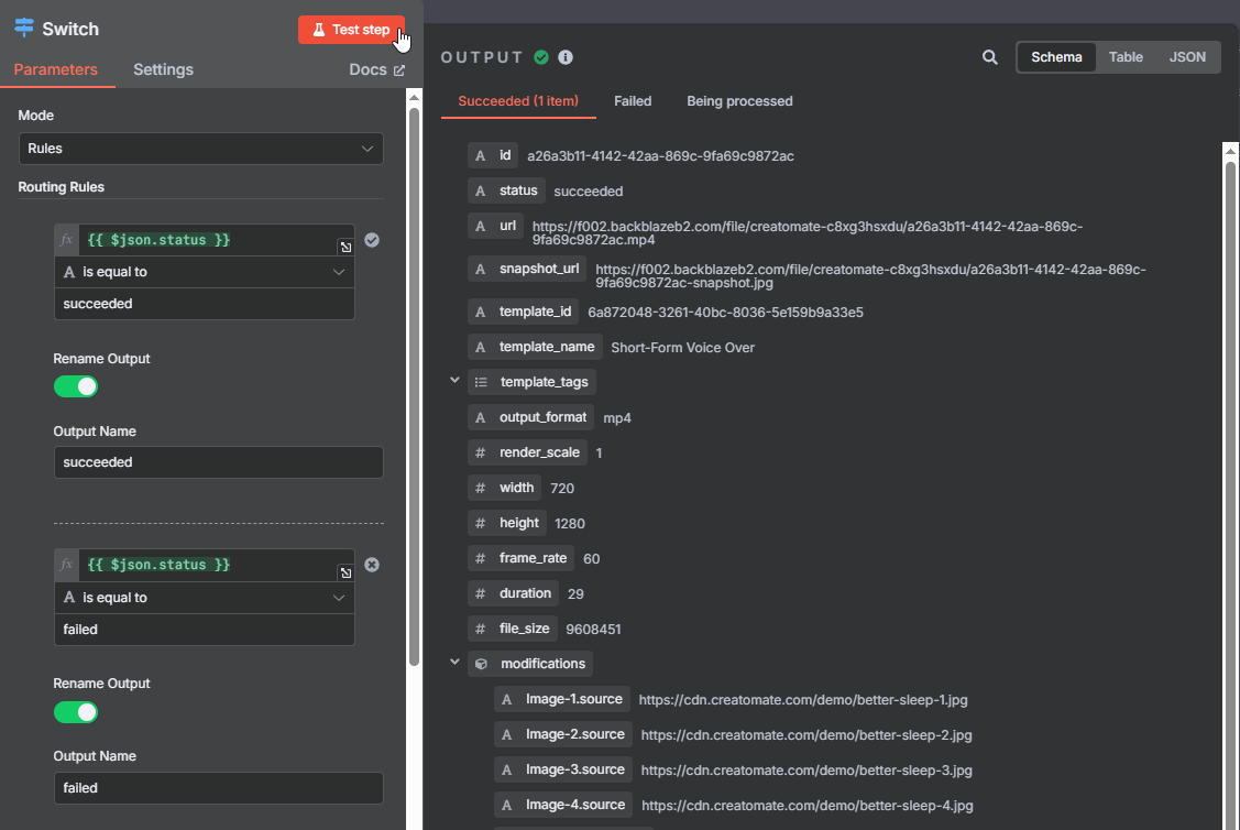 Now, click Test step. If everything worked, the output should show the video status as “succeeded” – meaning the render is complete and the video is ready to use: