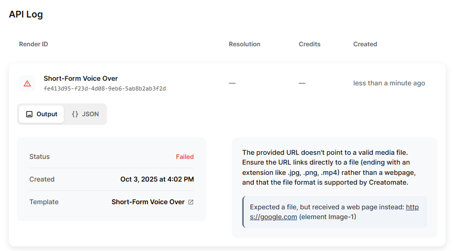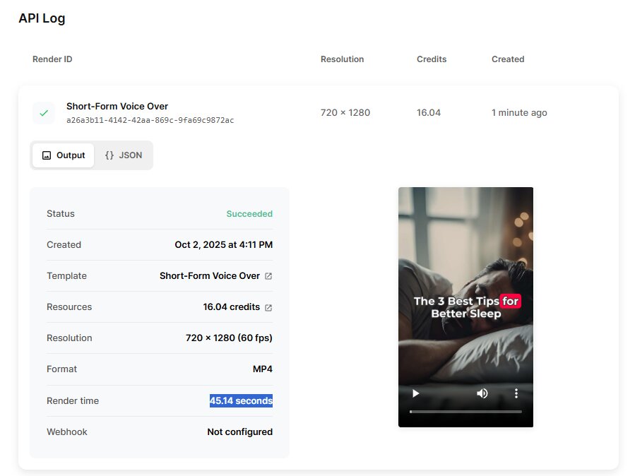 Start by visiting the API Log page in your Creatomate dashboard. Here, you can confirm whether the test video from the previous step has successfully completed (status = succeeded). If it hasn't finished yet, just wait a few moments. You can also see how long the video took to render. For example, my test video rendered in 45.14 seconds: