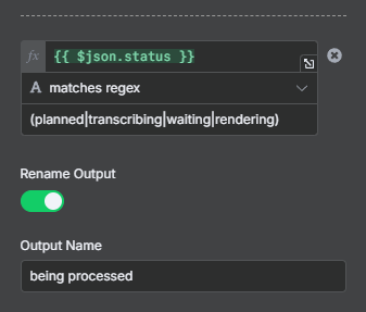 Next, we'll handle cases where the video is still processing. Since there are multiple possible statuses that mean the render isn't finished yet, we can group them into a single route. Add another routing rule, choose ‘status', and set it to matches regex with the following values: (planned|transcribing|waiting|rendering) Then, rename this output to being processed: