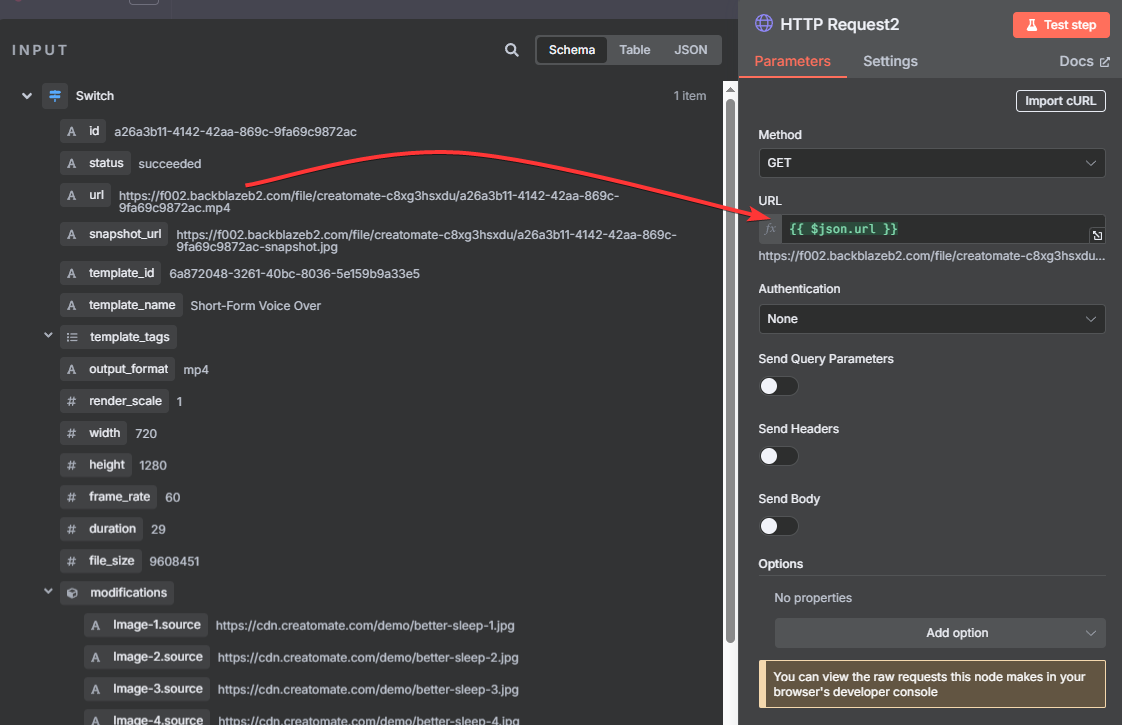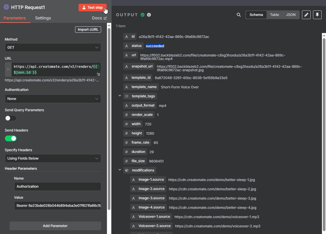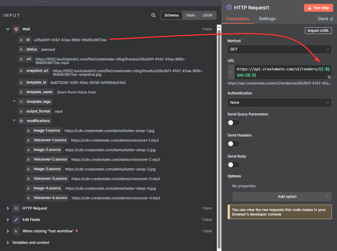 For the setup, select GET as the Method and enter this URL: https://api.creatomate.com/v2/renders/[ID]. Replace the [ID] placeholder with the id value from the Wait node, and be sure not to include any spaces: