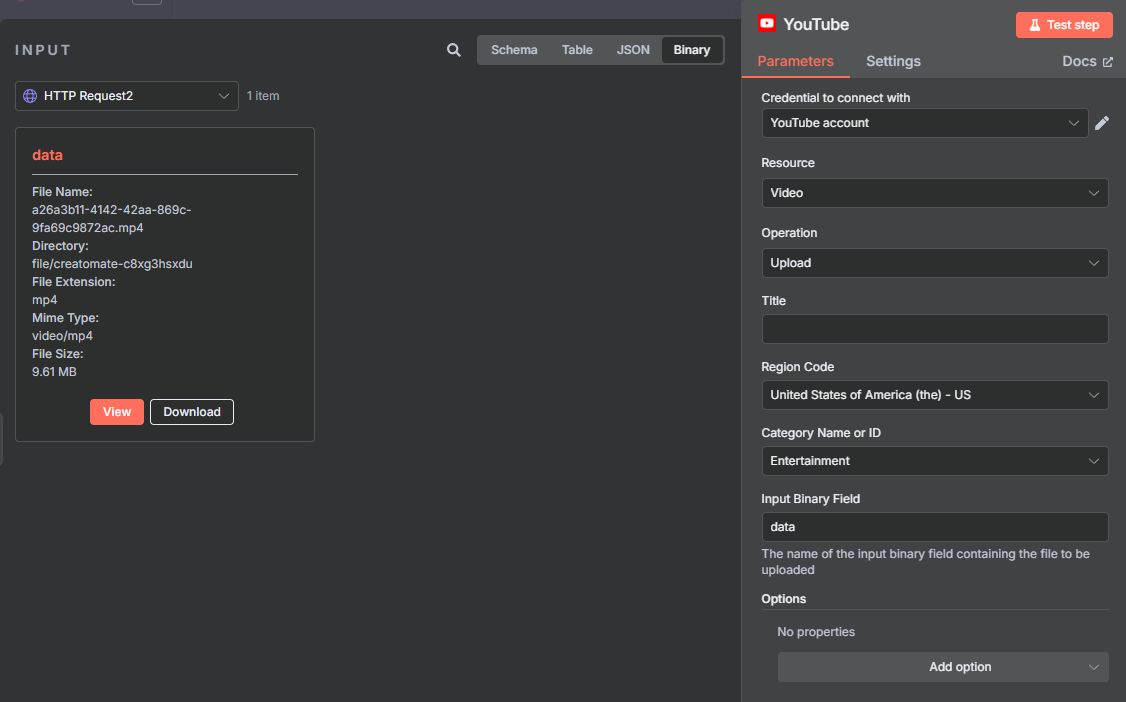 Now that the video has been generated, we can upload it to YouTube. The YouTube node requires the actual video file, not just the URL, so we'll first need to download the video.