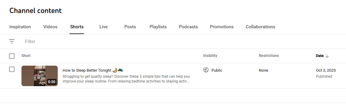 When I visit my YouTube channel's content page, I can see that the short has been successfully published: