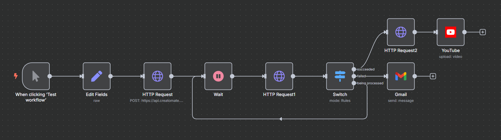 As mentioned earlier, if a video isn't ready after the first check, it simply needs more time. To handle this, connect the “being processed” branch back to the Wait node. This creates a loop that keeps checking until the status eventually changes to either “succeeded” or “failed”: