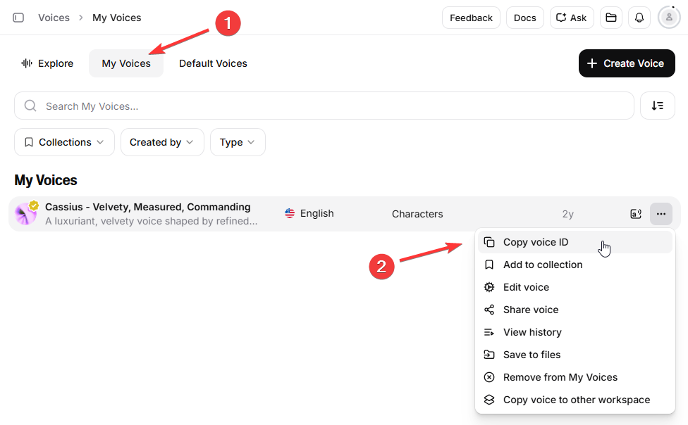 Go to the "My Voices" tab. You should now see the voice you just added. Click the three dots next to the voice and select Copy voice ID. Keep this ID handy – you'll need it in the next step: