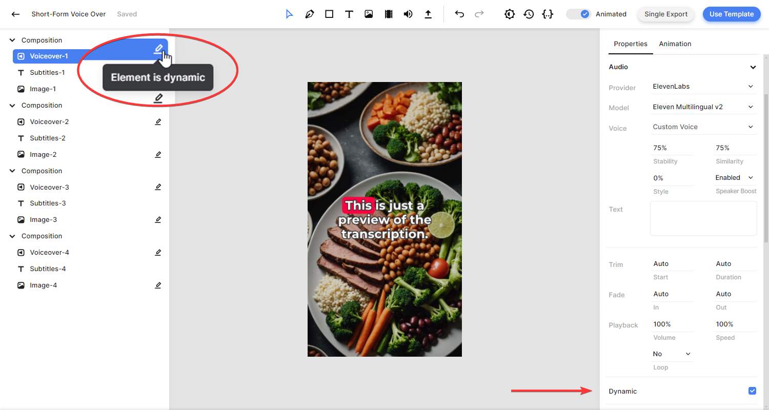 All voiceover elements are marked as dynamic, allowing them to be easily replaced through our script. Any text you add will automatically be converted into speech using the selected voice: