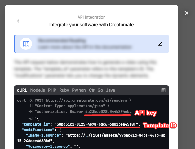 Let's look at the API request more closely. As you can see, you'll need to make a POST request to the "https://api.creatomate.com/v2/renders" endpoint. You'll need to specify an API key, a template ID, and the "modifications" parameter.