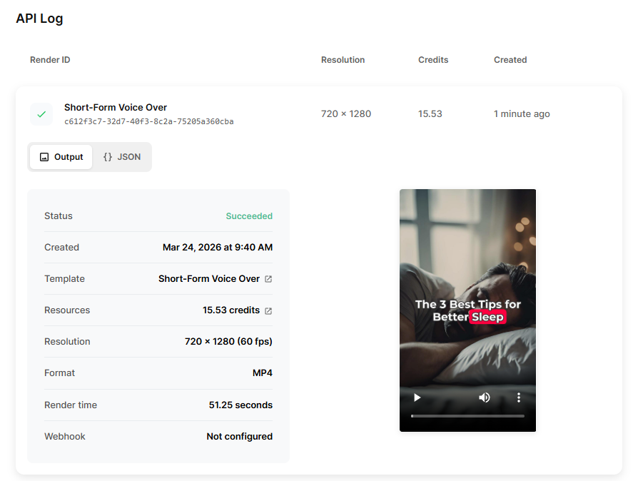 Tip: You can find your requests on the API Log page in your Creatomate dashboard, where the 50 most recent renders are displayed. If something goes wrong, this page will show the error message along with suggested fixes.