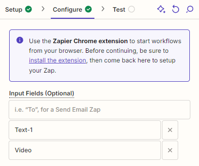 First, install Zapier's Chrome extension using the provided link. Next, we'll add two input fields: Text-1 and Video: