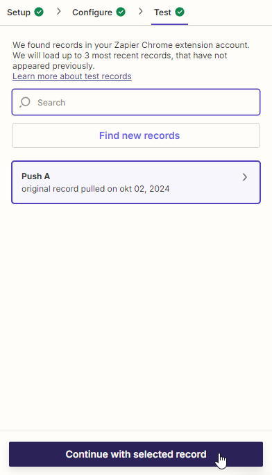 To make sure the trigger works, click Test trigger to generate some test data. Once the test is successful, click Continue with selected record to proceed to the next step: