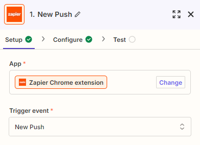 Once in the Zap editor, click the Trigger block. Search for and select Zapier Chrome extension as the app and New Push as the trigger event: