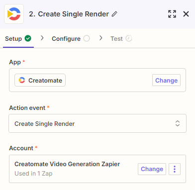 In this step, we'll set up an action for Creatomate to generate a video using the data provided by the trigger.