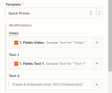 Zapier will now pull in the dynamic elements and list them under Modifications. We can then map the data from the Chrome extension to the template, as shown below: