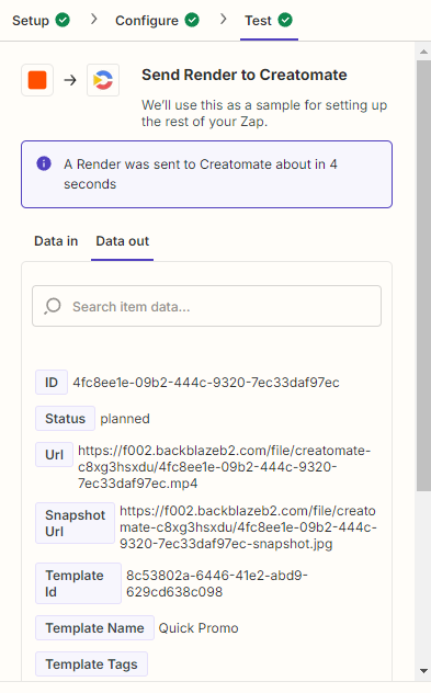 Click Test step to make sure Creatomate can generate a video. Once the test is successful, let's move on to the next step.
