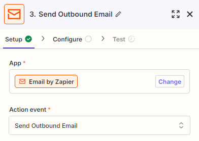Search for and select the Email by Zapier app with the Send Outbound Email action event: