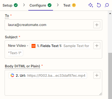 To set up the email action, start by entering the recipient's email address. Next, create a subject line. You can use static text, dynamic data from the trigger, or both. Finally, add the video link to the Body field by inserting Creatomate → URL: