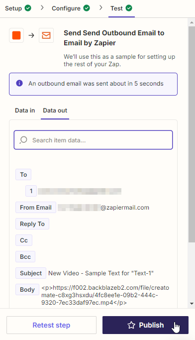 Let's click Test step to make sure Zapier can send the email. Once the test is succesful, all you have to do is hit the Publish button to activate your Zap: