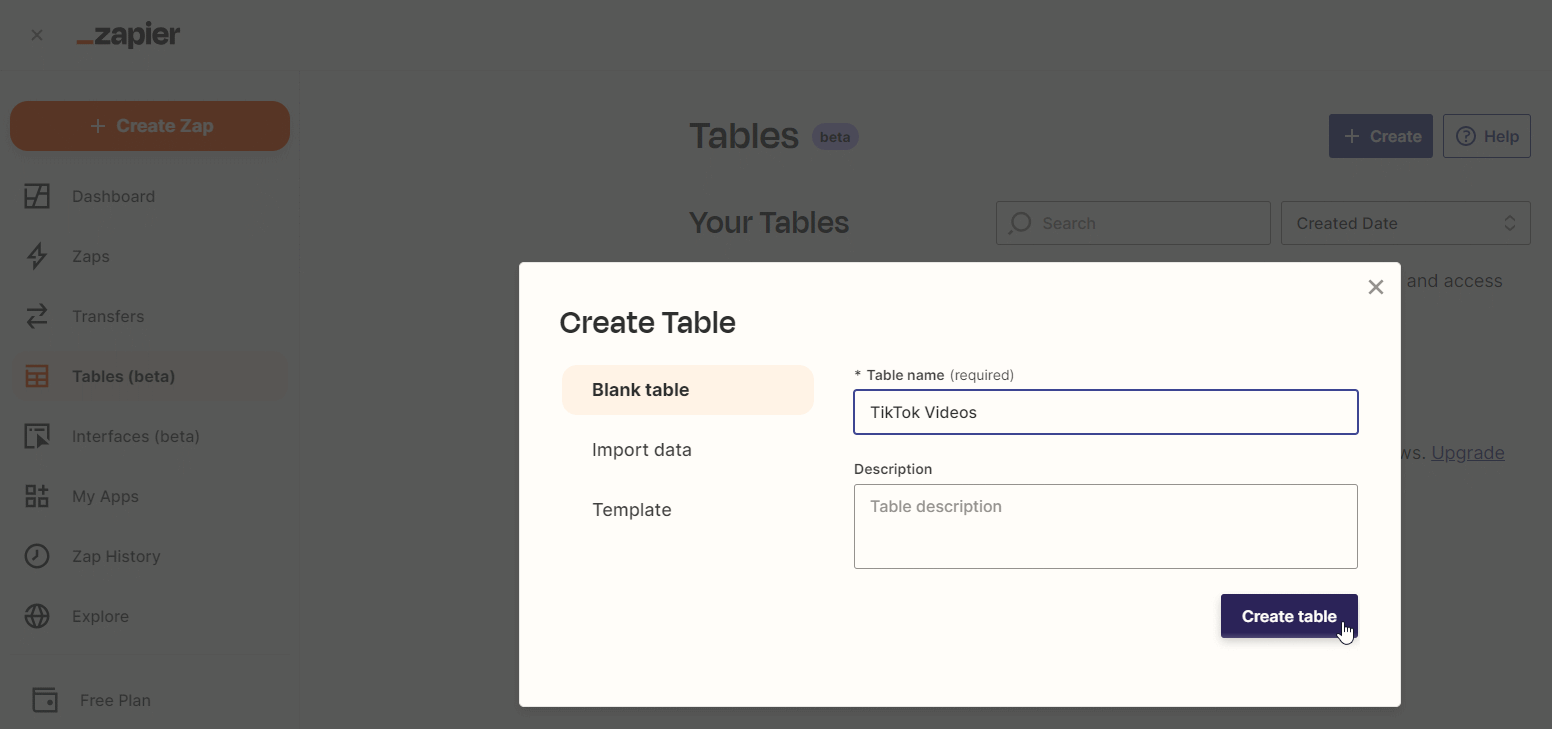 Log in to your Zapier account and navigate to the Tables (beta) page. Click the + Create button, enter a name, like TikTok Videos, then click Create table: