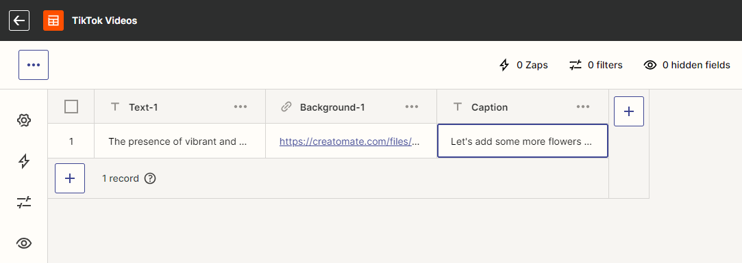 Let's open our newly created table. The goal here is to set up fields according to the dynamic elements within the template. In this example we'll only connect Text-1 and Background-1, so let's create columns with similar names for these elements. Additionally, we will add a column named Caption that contains a text description for our TikTok posts. Now that we've got our columns set up, let's fill in the first record of the table with data: