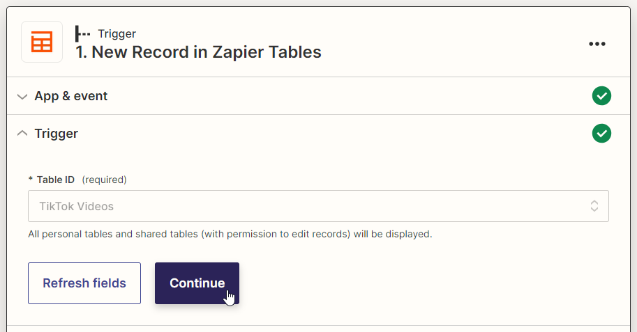 Next, set up your trigger step. Select your TikTok Videos table in the Table ID field, and click Continue: