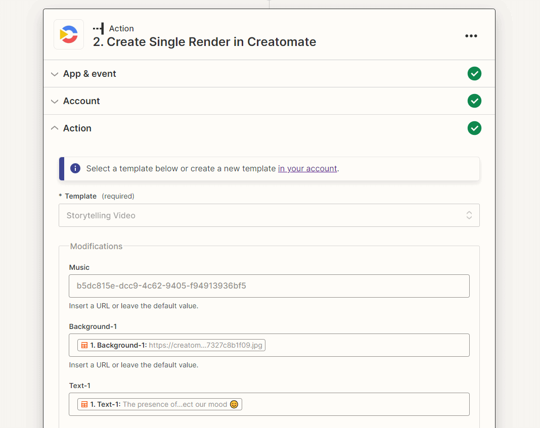 On the Action page, select your Storytelling Video template in the Template field first. The templates' dynamic elements will automatically be detected and listed under Modifications. We can now map data from our table to the template. As we've only created two fields for this, select Zapier Tables -> Background-1 in the Background-1 field and Zapier Tables -> Text-1 in the Text-1 field. We'll keep the other modification fields unchanged, so the default values from the template will be used. When done, click Continue: