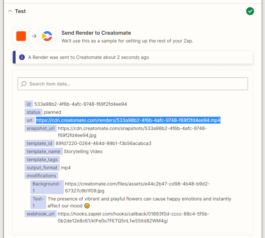 Click Test step on the Test page to make sure Creatomate can generate a video based on the template and provided data. You can view the video by visiting the URL provided in the test result. It may take some time to render the video. So if you get a Not Found message, wait a few seconds and refresh the page. Note that this only occurs during testing, because once the Zap has been published, it will wait until the video completes before proceeding. Once the test passes, move on to the next step: