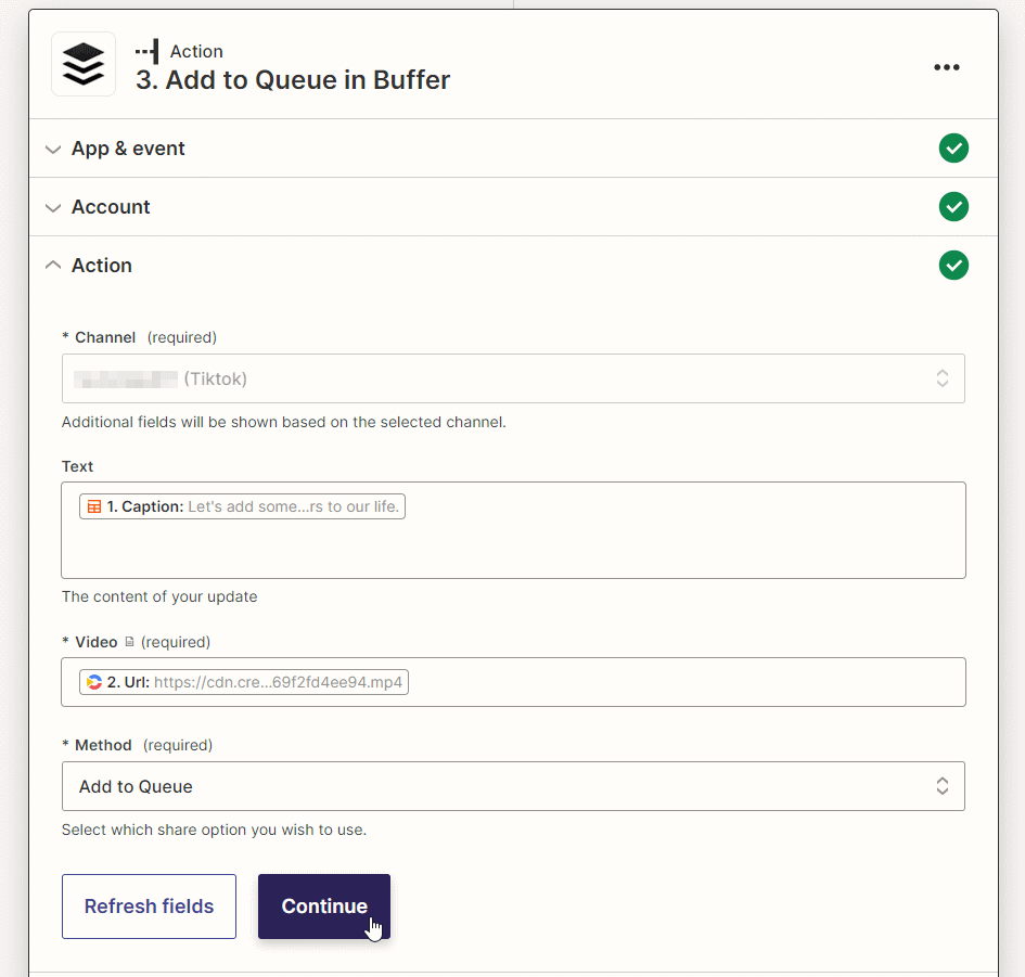 On the Action page, select your TikTok account in the Channel field first. Then, select Zapier Tables -> Caption in the Text field and Creatomate -> Url in the Video field. In the Method field, you can choose when you want to post your videos. When done, click Continue:
