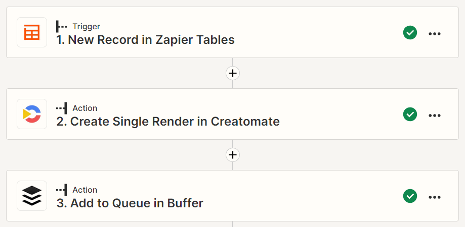 The first thing we'll do is create a video template in Creatomate, which will form the basis of all of our videos. We'll then set up an automated workflow using Zapier. To do this, we'll create a table that will serve as the data source for our Zap. Creatomate then generates a video using the template and data from our table. Once the video is ready, it will be sent to Buffer for posting on TikTok. Here is what our Zap will look like: