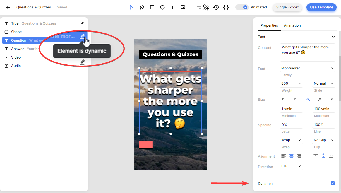 Let's take a look at the left side panel. Here, you'll find the elements that make up your template. Notice that the Title, Shape, Question, Answer, and Video elements are marked as dynamic. This indicates that they act as placeholders, which can be replaced with other text and media using our Zapier workflow. If you want to make an element dynamic or not, simply select it in the left side panel and (un)check the Dynamic property in the right-hand panel: