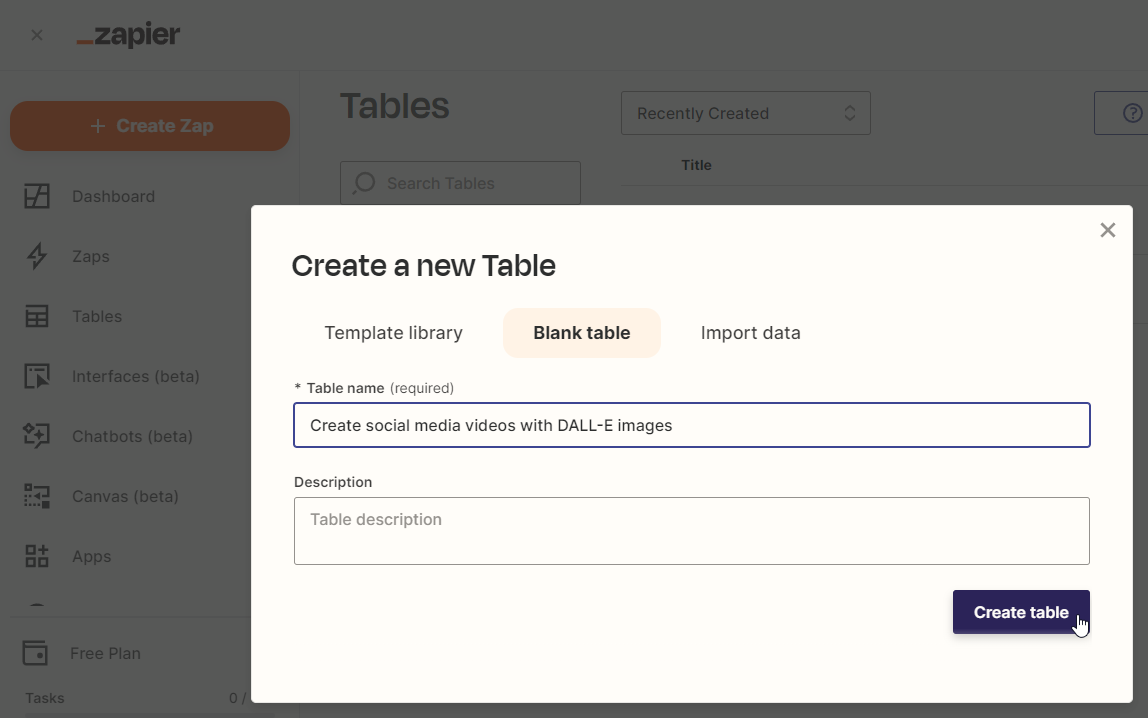 Log in to your Zapier account and navigate to the Tables page. Click + Create, choose Blank table, enter a table name, and click Create table: