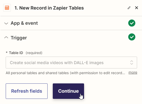 On the Trigger page, select your table in the Table ID field. Then, click Continue: