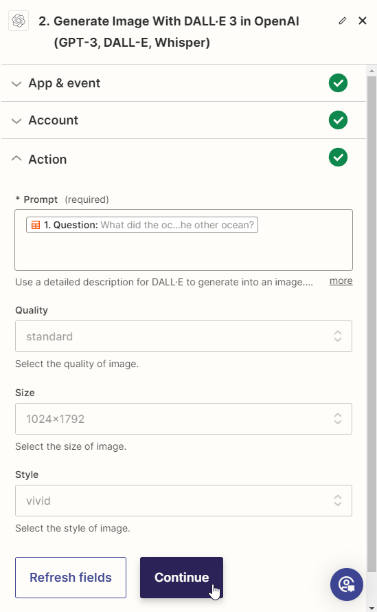 On the Action page, we'll instruct DALL·E on the type of image we want. In the Prompt field, select Zapier Tables -> Question to generate an image related to the riddle's question. If you prefer, you can customize the prompt to give more specific instructions to DALL·E.