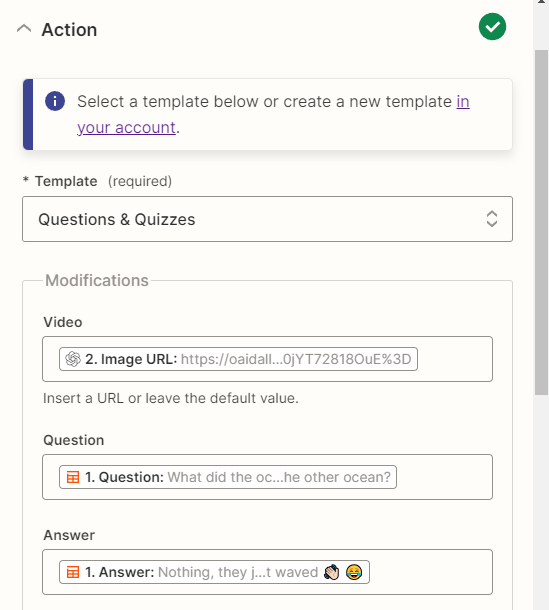 Then, the dynamic elements in your template appear under Modifications. Let's connect our riddle and the DALL·E image to our template as follows: