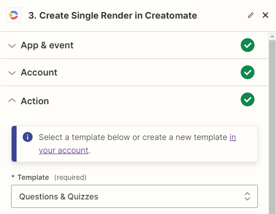 Click + to add a step to your Zap. Search for and select Creatomate as the app, and choose Create Single Render as the event. Continue by selecting your account or signing in with your project's API key first. Then, click Continue.