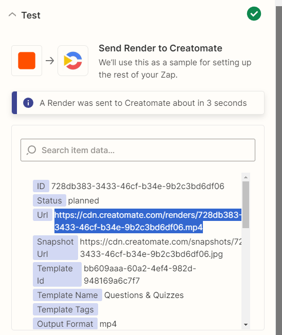 On the Test page, click Test step to check if Creatomate can generate a video based on the provided data. In the test results, you'll find a URL. You can visit this URL to preview the video. Please note that video rendering takes some time, so you might encounter a 'not found' message. If that happens, wait a few seconds and refresh the page. This only occurs during the setup of your Zap; once the workflow is live, Zapier will wait for the video to complete before moving on to the next workflow action. If the test succeeds, proceed to the final step.