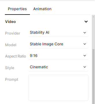 Now select the Video element. This is the element that'll be generated by Stability AI. To set this up, we need to change its Provider from "Uploaded File" to "Stability AI" in the right hand property panel, like so: