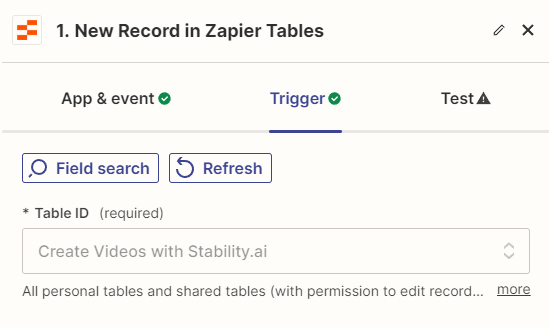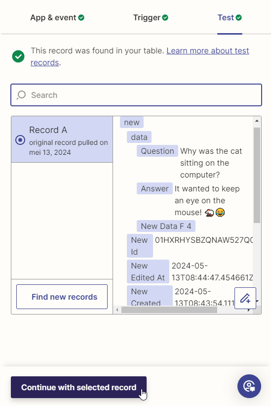 Under Test, click Test trigger to make sure Zapier can find a record from the table. When the test is successful, click "Continue with selected record", and move on to the next step: