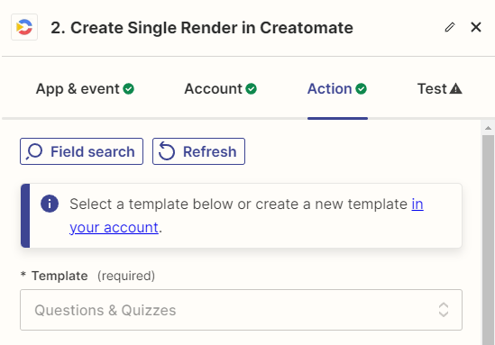 Search for the Creatomate app, and choose the Create Single Render event. Continue by selecting your account or signing in with your project's API key, which you can find under Project Settings in your Creatomate dashboard. Then, click Continue.