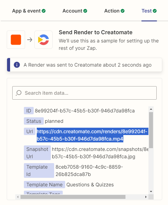 Now that everything is set up correctly, click Test step. What happens is as follows; Zapier instructs Creatomate to create a video using the selected template and input data. In turn, Creatomate uses Stability AI to generate the background video, then puts it in the template, generates the final video, and finally sends it back to Zapier.