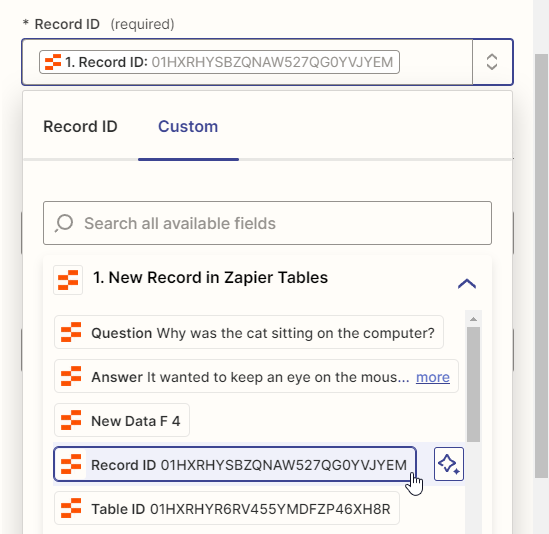 Next, in the Record ID field, select Zapier Tables -> Record ID, which you can find under the Custom tab: