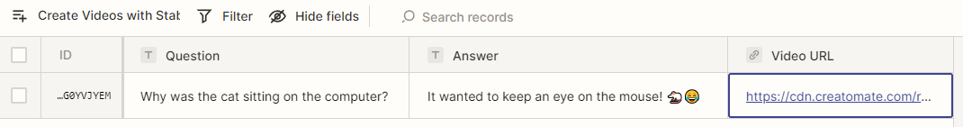 Click Test step on the Test page to make sure Zapier is able to update the record with a link to the video. After that, go back to your table. You'll see that the video link is there: