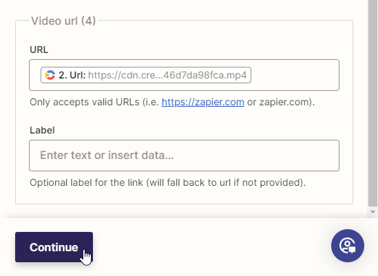 Then, select Creatomate -> Url in the Video url field, and click Continue:
