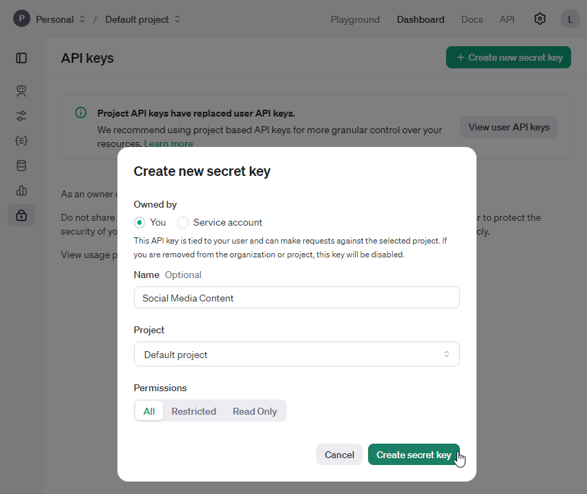 Next, go to your dashboard and click on the lock icon in the left-side menu. Then, click Create new secret key, provide a name, and click Create secret key: