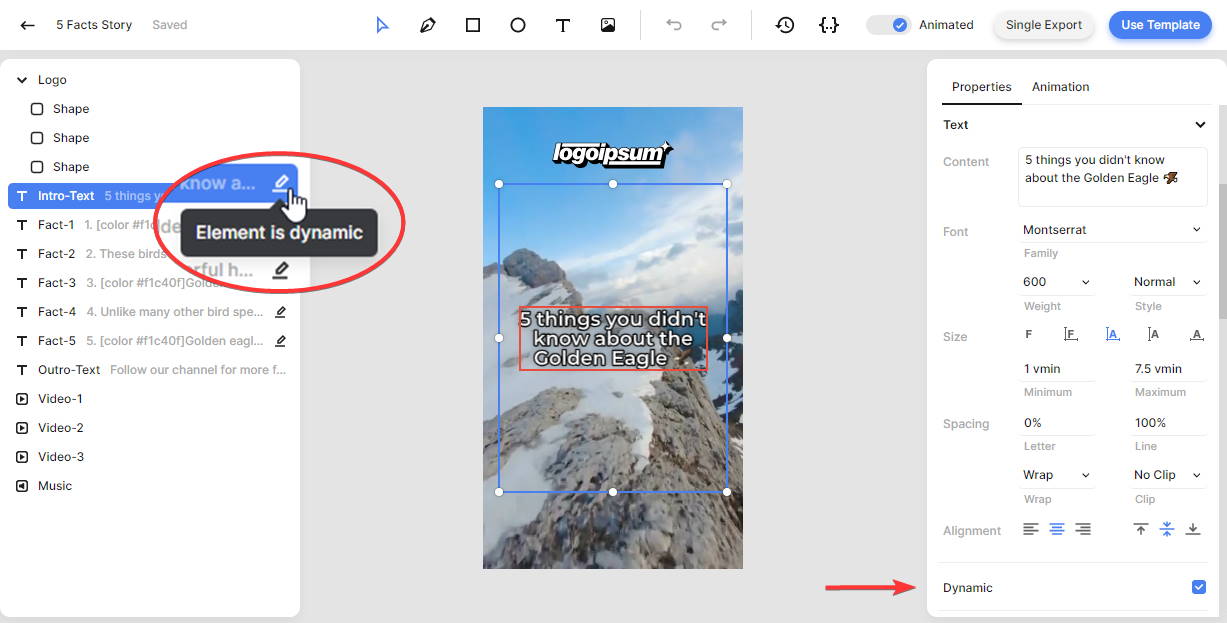 Let's take a closer look at our template and how we can use it for automation. In the left side panel, you'll find the elements that make up our template. You'll notice that the Intro-Text and all five facts are marked as dynamic, meaning we can replace their content with text generated by ChatGPT through the Zap we're about to set up.