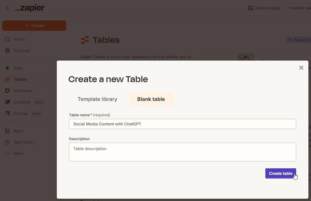 Log in to your Zapier account. From the left menu, navigate to the Tables page. Click the Start blank button, enter a name, and hit Create table: