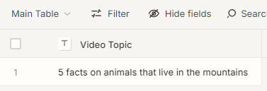 We only need to input a video topic into our automation using this table. To do this, create a text field called Video Topic and enter 5 facts on animals that live in the mountains for the first record: