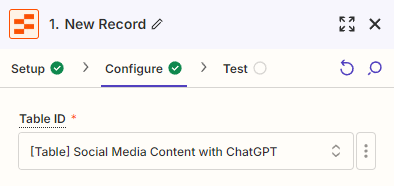 Every Zap starts with a trigger that initiates the process. For demonstration purposes, I'll show you how to use a Zapier Table. However, you can choose any app for this, such as when a new record is added to an Airtable base or a new row is created in your Google Sheets document. The trigger should also provide a topic for your social media videos.